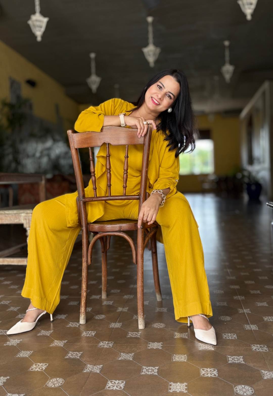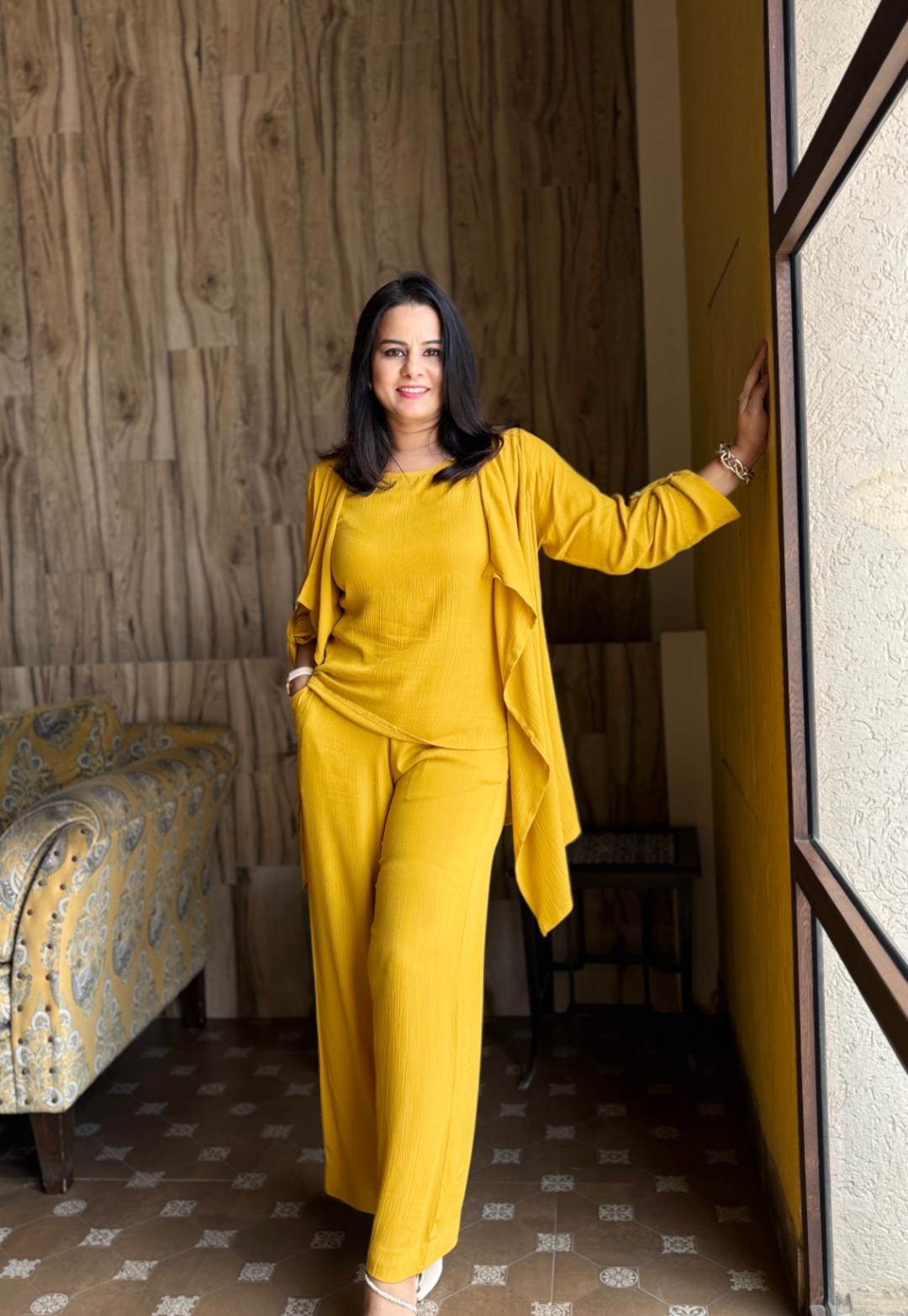 Bright, bold, and effortlessly chic—this chrome yellow 3-piece co-ord set is a statement blend of comfort and contemporary style. With a breezy shrug, relaxed-fit top, and breathable bottoms, it’s crafted from lightweight crush cotton to keep you stylish from day to night.