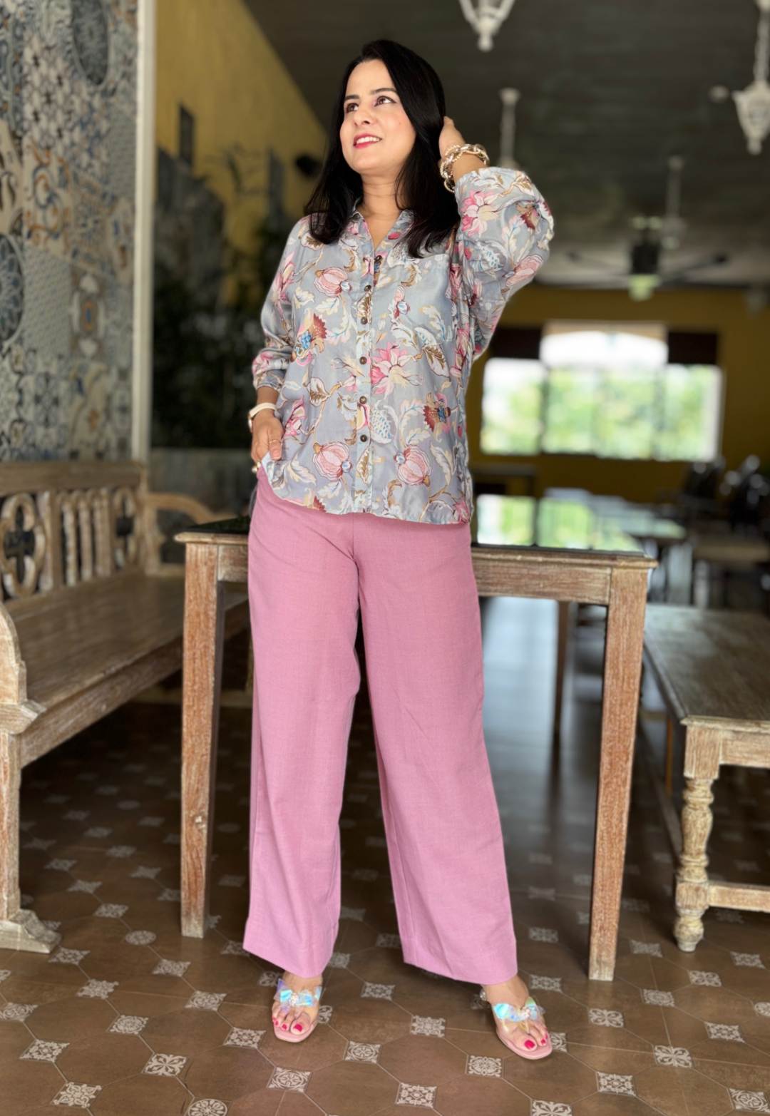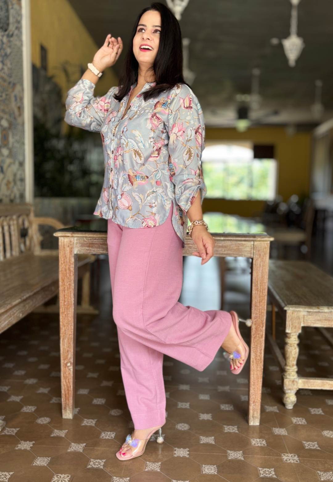 Soft, graceful, and full of charm — the Pastel Bloom Co-ord Set brings together soothing florals and an elegant contrast of hues. The digitally printed shirt in muted grey tones blooms with pastel pink and lilac flowers, perfectly paired with solid onion pink pants for a touch of subtle sophistication.