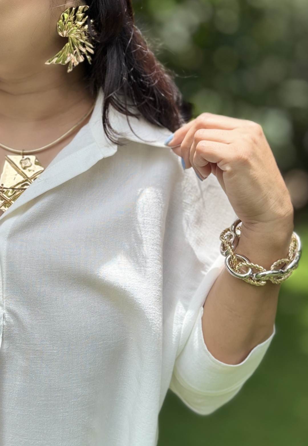 This white asymmetric co-ord set is a wardrobe essential for lovers of elevated basics. The draped hem top and versatile pants offer a refined take on comfort.