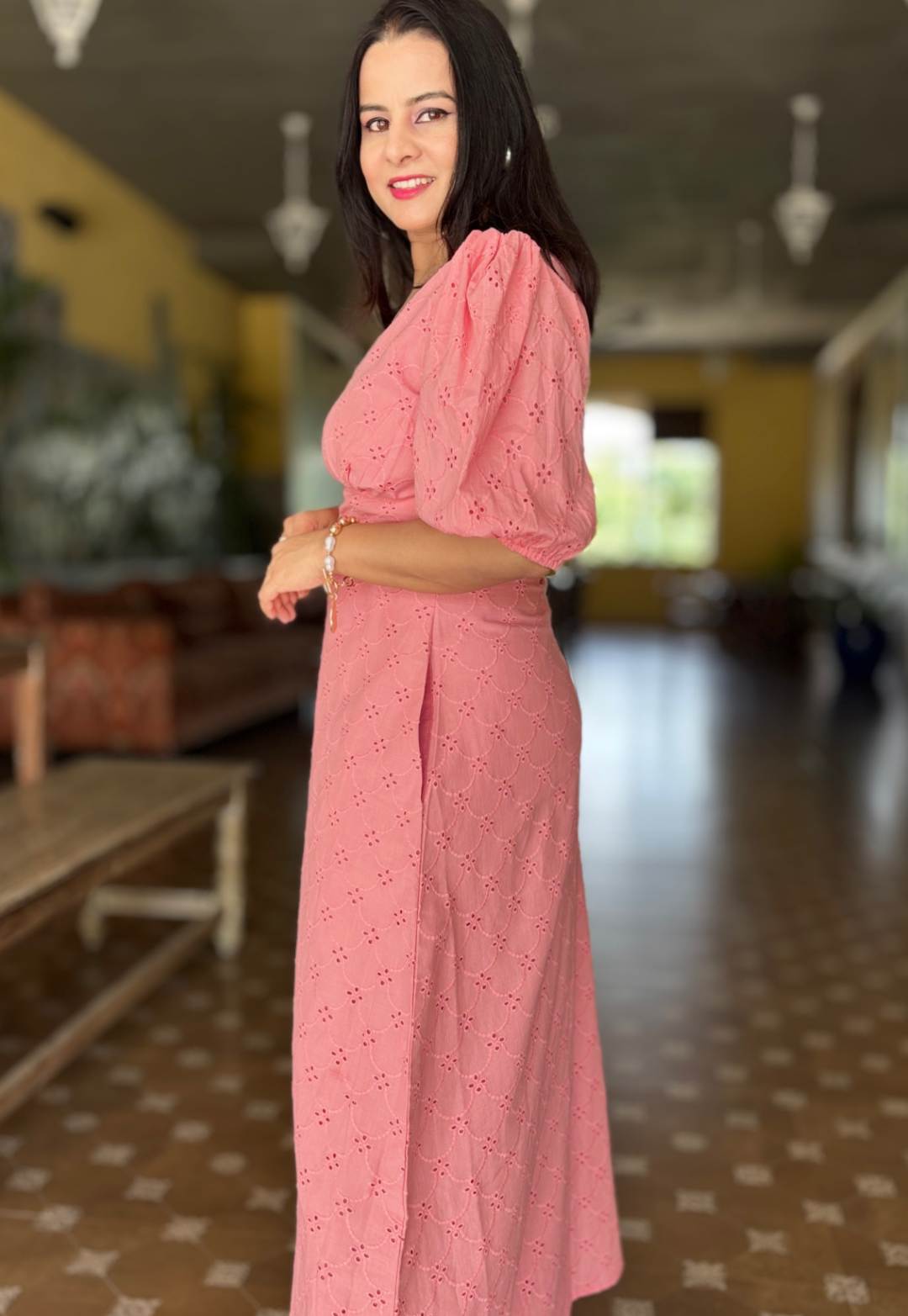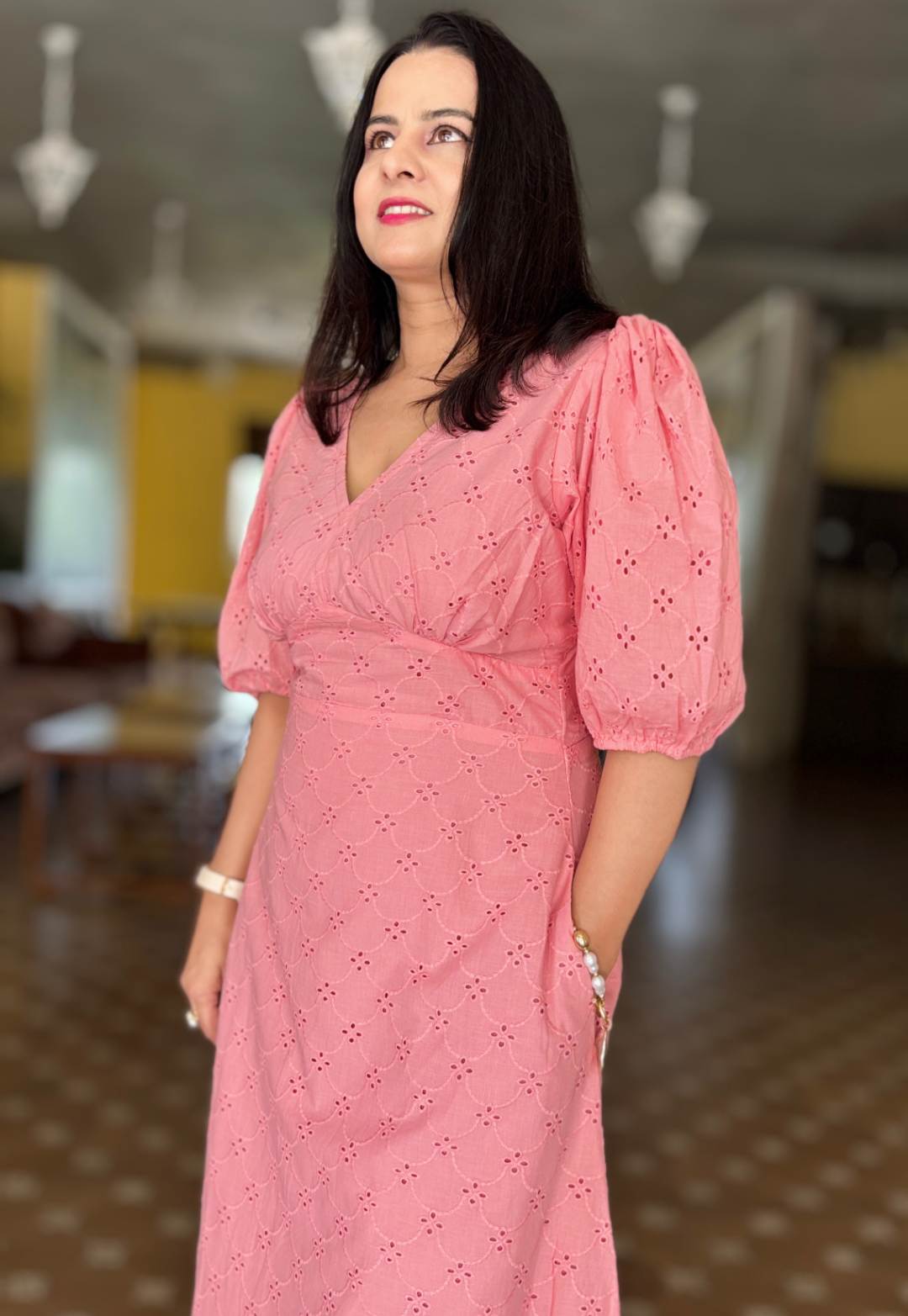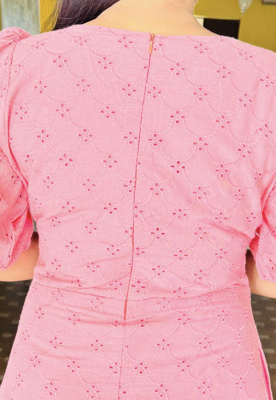 Radiate charm and comfort with our Peach Hakoba Schiffli Cotton Dress, thoughtfully designed with intricate embroidery and a flattering silhouette. The soft cotton fabric with lining ensures breathability, while functional details add everyday practicality.