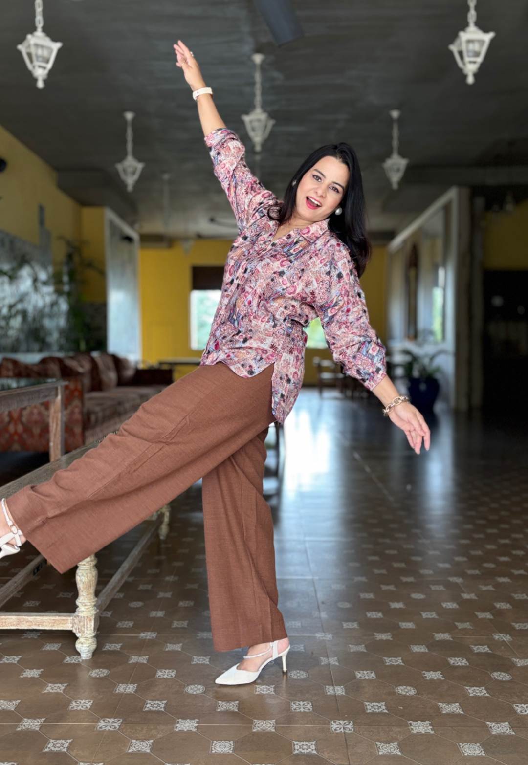 Pair it with brown, beige, or off-white trousers for a coordinated look, or dress it down with denim for an artsy-casual vibe.