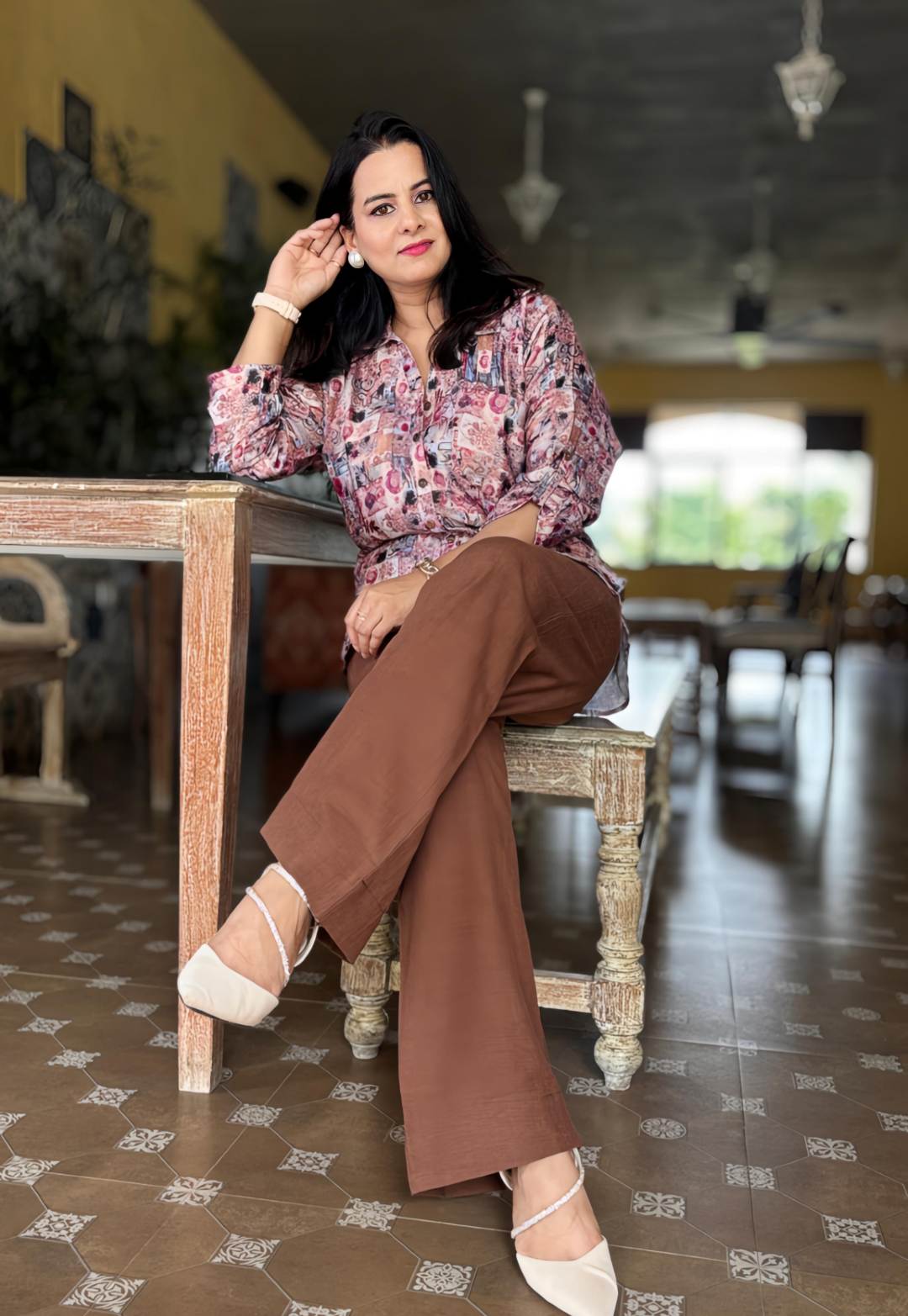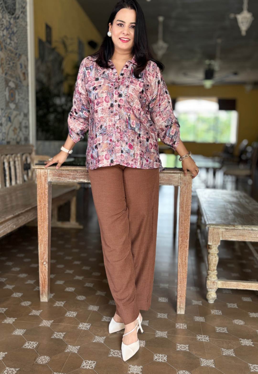 A piece of wearable art — the Abstract Art Cotton-Satin Shirt celebrates color, creativity, and comfort in one elegant form. Featuring intricate digital mosaic-inspired prints in earthy pinks, mauves, and browns, it adds instant depth and detail to any look.