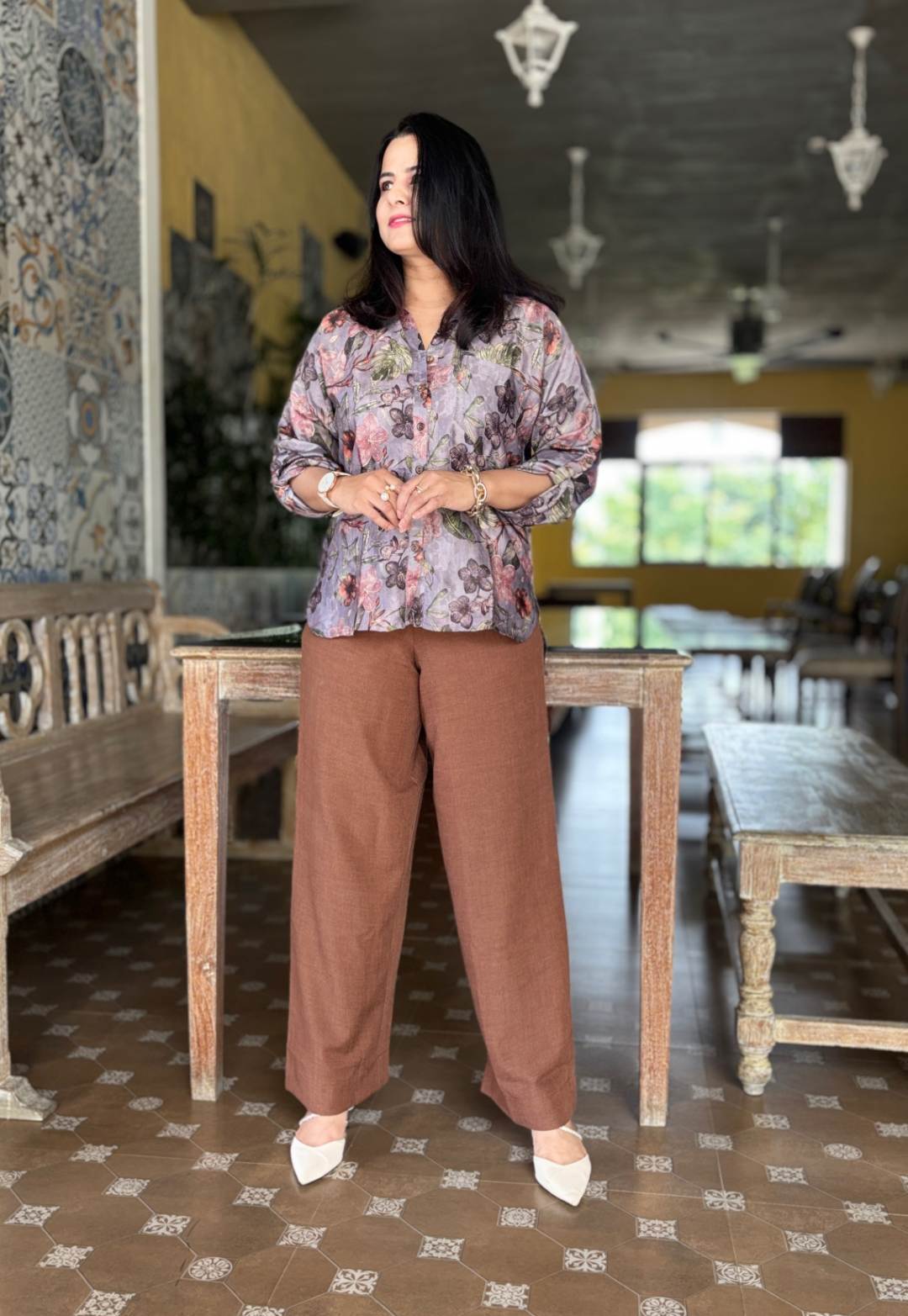 Refined, soft, and beautifully detailed — the Earthy Floral Cotton-Satin Shirt blends vintage charm with modern comfort. Featuring digitally printed florals in blush, green, and rust over a muted grey base, this shirt captures the quiet sophistication of timeless style.